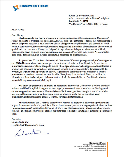 Consumers’ Forum ribadisce anche con la nuova presidenza eletta a luglio scorso, la completa adesione allo spirito con cui Consumers’ Forum ha siglato il protocollo di intesa con ANDMI, e cioè che entrambe le realtà, nel rappresentare le istanze dei propri associati e nella consapevolezza di rappresentare gli interessi più generali di tutti i cittadini consumatori, lavorano congiuntamente per garantire il massimo di tracciabilità, di salubrità, di qualità e di convenienza nell’acquisto dei prodotti agroalimentari da parte dei consumatori finali, riconoscendo sia di primaria importanza il ruolo dei mercati all’ingrosso e dei Centri Agroalimentari quali anelli fondamentali nel sistema distributivo nazionale ed internazionale.