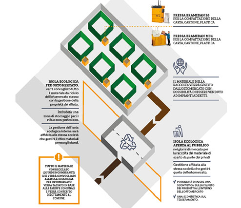 L’ente gestore metterà a disposizione il servizio di raccolta puntuale tramite un’azienda individuata e preposta la quale convoglierà tutto il materiale riciclabile e non, nell'isola ecologica. Da quel momento tutto ciò diventerà proprietà dell’Ente gestore, con la possibilità di vendita del materiale stesso ad aziende preposte al riciclo, mentre per l'indifferenziato verrà sempre raccolto dal Comune con la tariffazione a carico degli standisti stessi, ma convogliato e organizzato dall'Azienda nominata dall'Ortomercato.