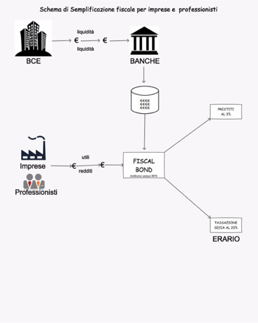 - - investimento degli utili non distribuiti (per imprese e società) o reddito rilevato (per lavoratori autonomi) in titoli di stato emessi ad hoc denominati - Fiscal Bond - con rimborso ad un anno pari all’80% del valore nominale. Il 20% non restituito rappresenterebbe una tassazione flat omnicomprensiva. L’applicazione potrà essere graduale e completata in periodo di tre anni (sottoscrizione pari al 10% degli utili/reddito per i successivi tre anni dietro accordo fiscale per lo stesso periodo).